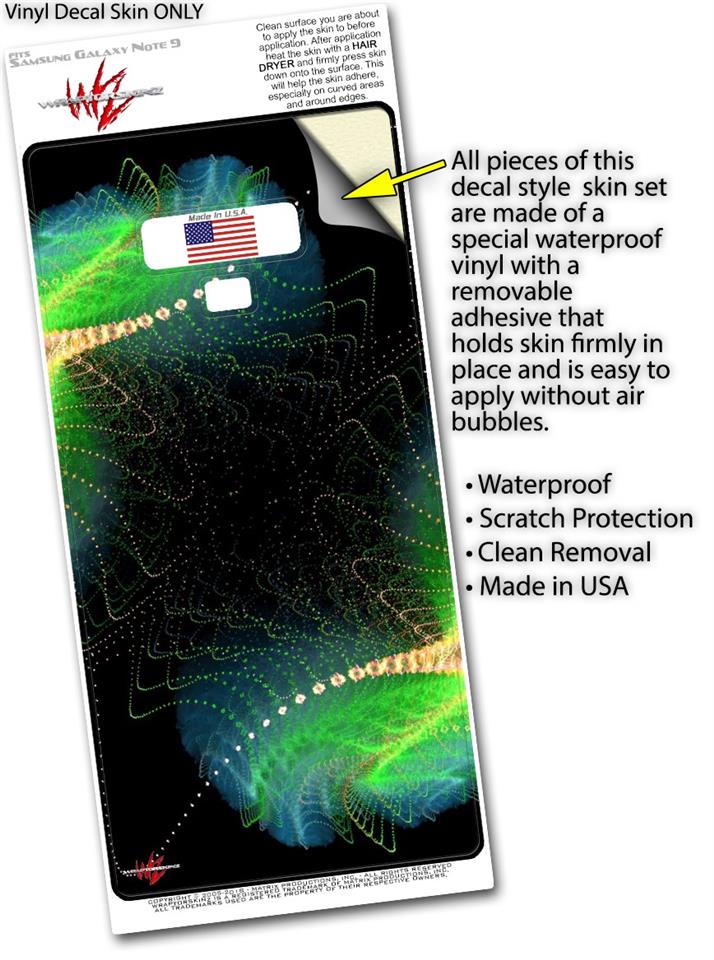 WraptorSkinz® skin wraps for the Samsung Galaxy Note 9 are printed using superb photo quality designs and vibrant colors printed with special fade resistant inks that last even in direct sun for years. WraptorSkinz are a composite of two layers of commercial grade materials. The bottom layer is a soft, flexible vinyl with a special removable adhesive that is easily positioned, applied without air bubbles. Next, we print the bottom layer with UV protected, fade resistant inks that deliver superb photo quality designs in vibrant colors. Finally, we bond a professional grade laminate over the entire Galaxy Note 9 skin adding a glossy protective finish. This product is not affiliated with or endorsed by Samsung.