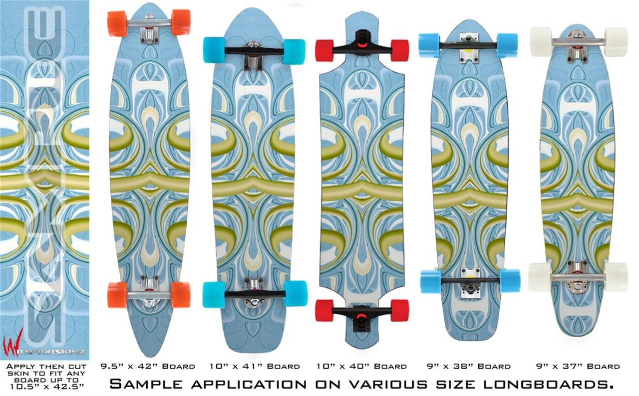 Our longboard skins are made so that one size fits boards up to 10” wide x 42” long. This means after applying the skin it you will trimming to fit you’re the shape of your board with a sharp utility knife.