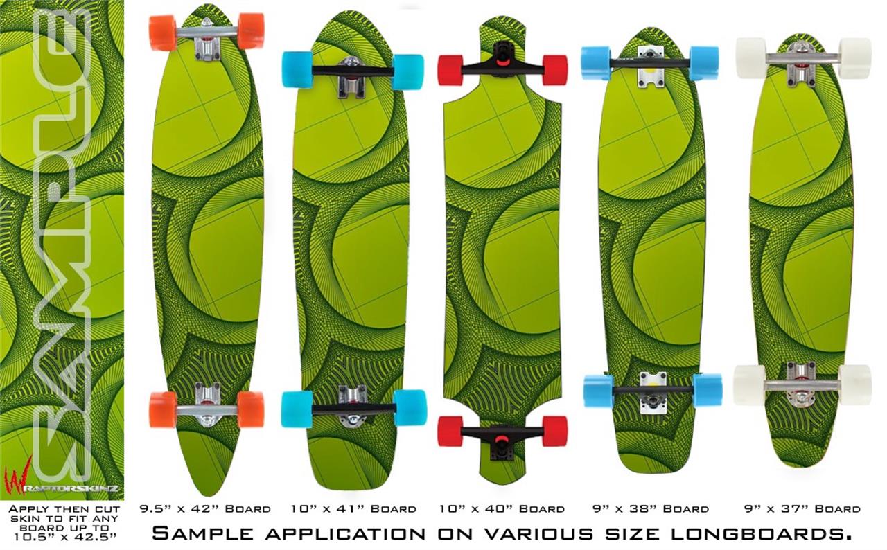 Our longboard skins are made so that one size fits boards up to 10” wide x 42” long. This means after applying the skin it you will trimming to fit you’re the shape of your board with a sharp utility knife.