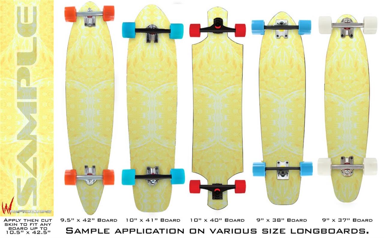 Our longboard skins are made so that one size fits boards up to 10” wide x 42” long. This means after applying the skin it you will trimming to fit you’re the shape of your board with a sharp utility knife.