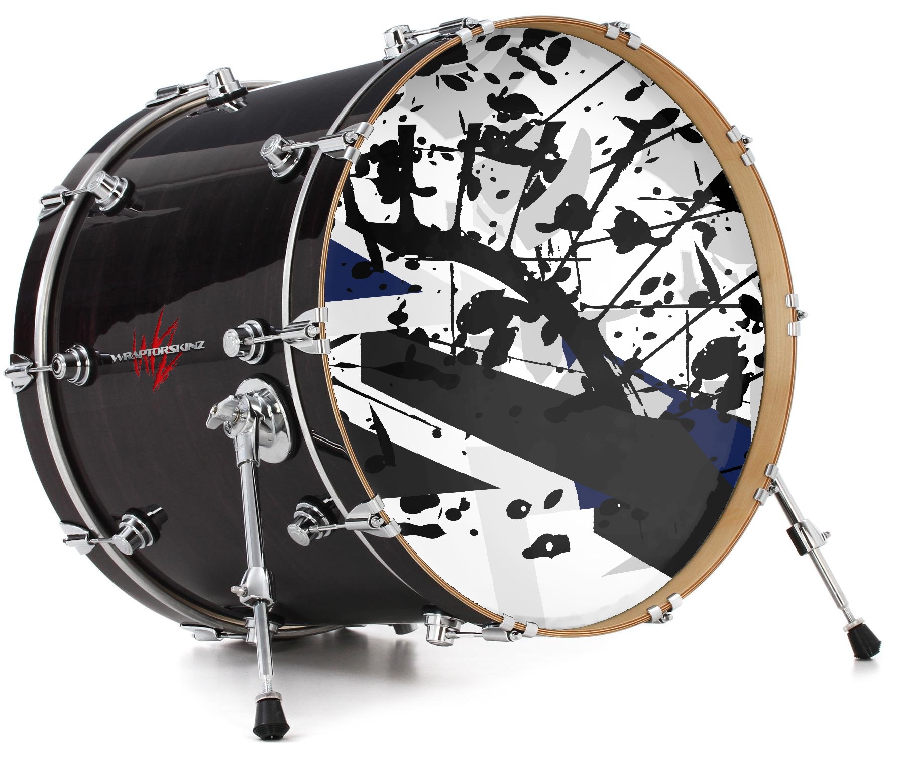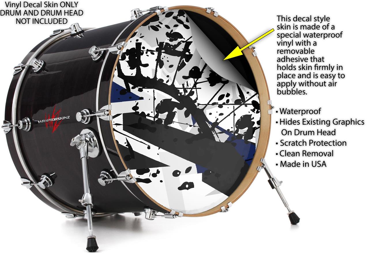This design also available in other sizes. WraptorSkinz® skin wraps compatible with most kick drum heads. Printed using superb photo quality designs and vibrant colors printed with special fade resistant inks that last even in direct sun for years. WraptorSkinz are a composite three layer commercial grade materials vinyl. The bottom layer is a air release, grey block out removable adhesive that hides existing graphics on the drum head and is easily applied without air bubbles. The middle layer is a flexible vinyl printed with UV protected, fade resistant inks that deliver superb photo quality designs in vibrant colors. Finally, we bond a professional grade laminate over the entire skin adding a glossy protective finish.