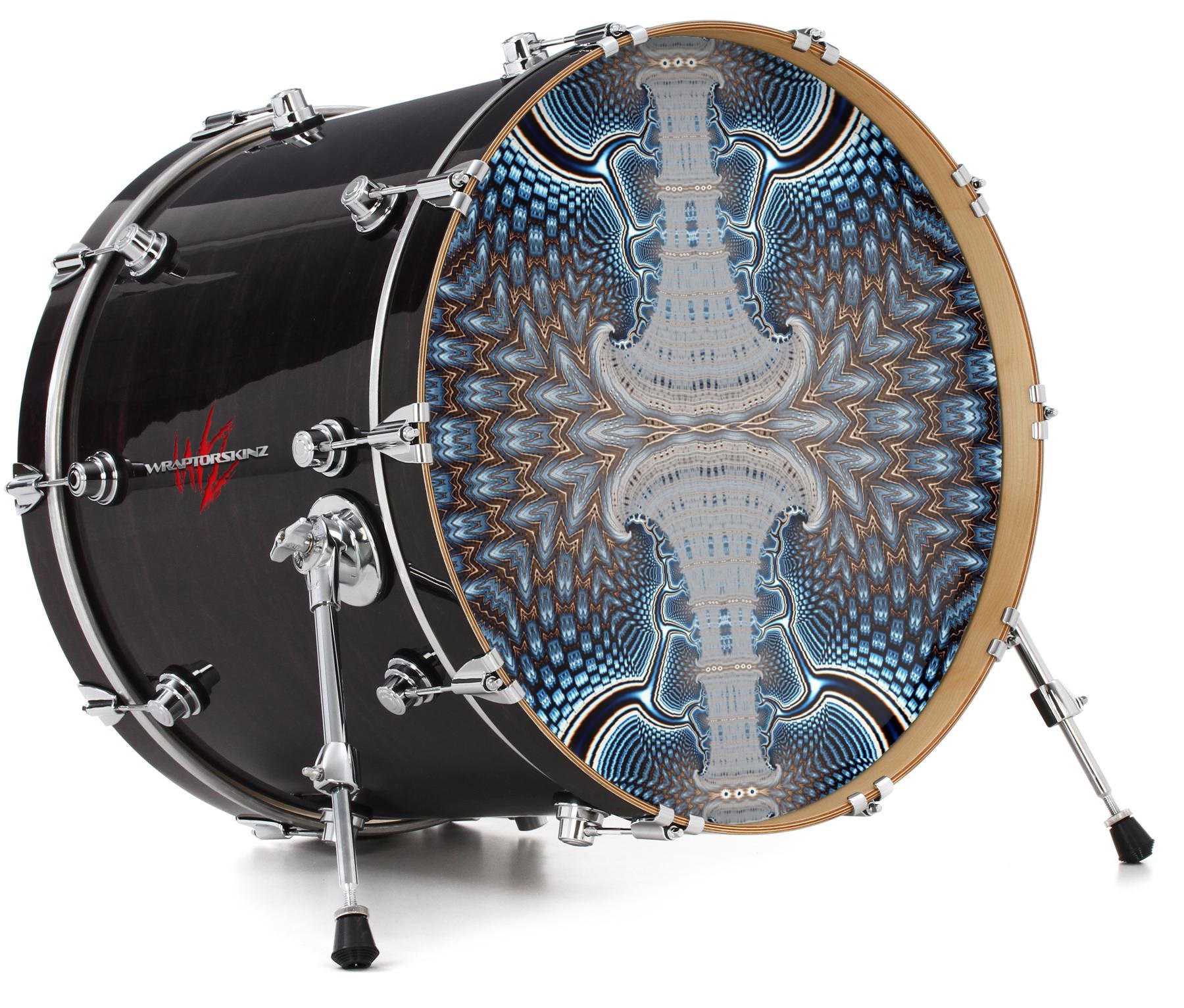 This design also available in other sizes. WraptorSkinz® skin wraps compatible with most kick drum heads. Printed using superb photo quality designs and vibrant colors printed with special fade resistant inks that last even in direct sun for years. WraptorSkinz are a composite three layer commercial grade materials vinyl. The bottom layer is a air release, grey block out removable adhesive that hides existing graphics on the drum head and is easily applied without air bubbles. The middle layer is a flexible vinyl printed with UV protected, fade resistant inks that deliver superb photo quality designs in vibrant colors. Finally, we bond a professional grade laminate over the entire skin adding a glossy protective finish.