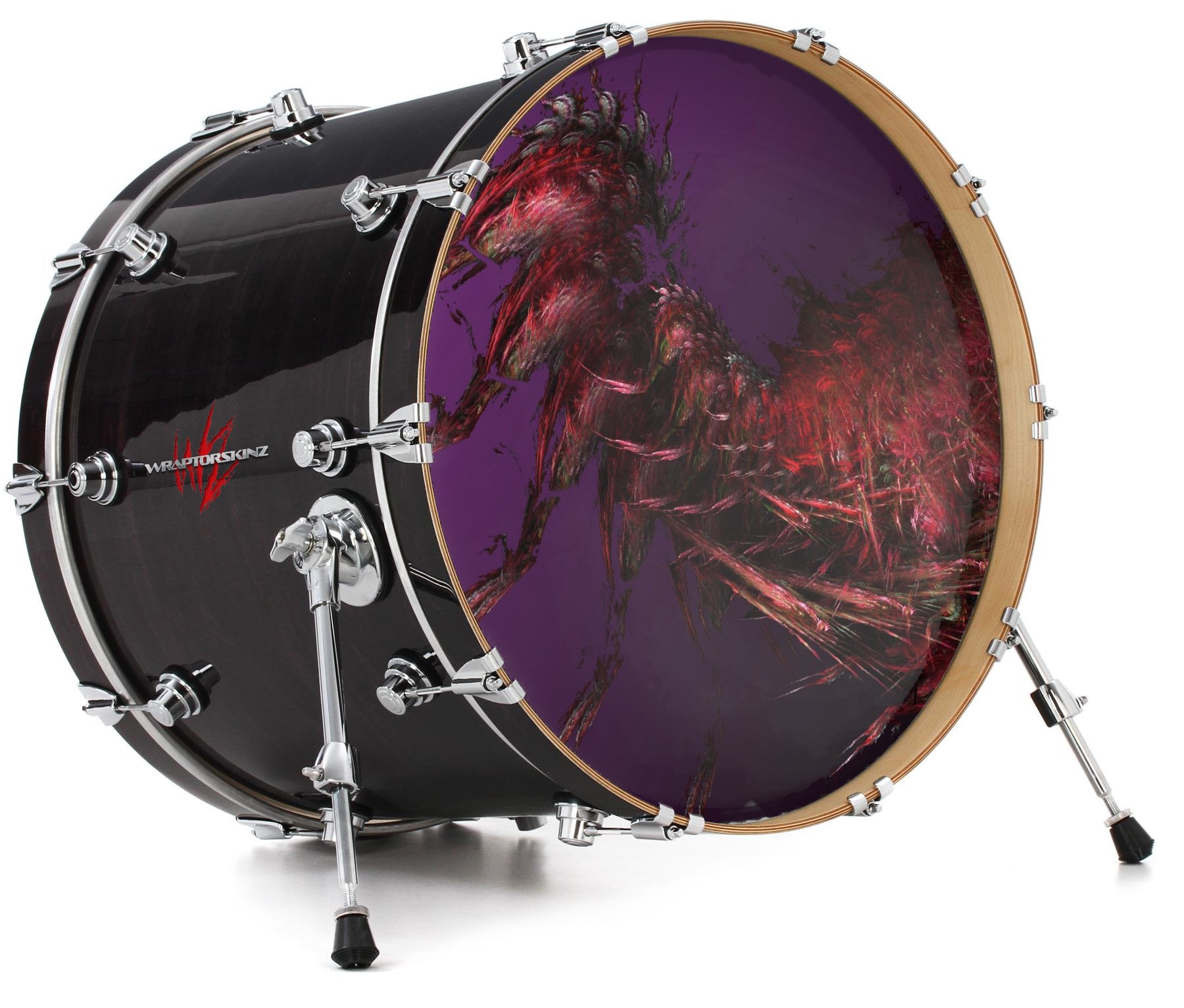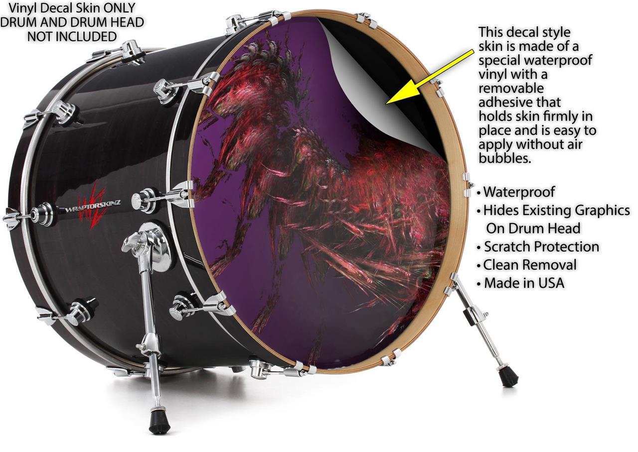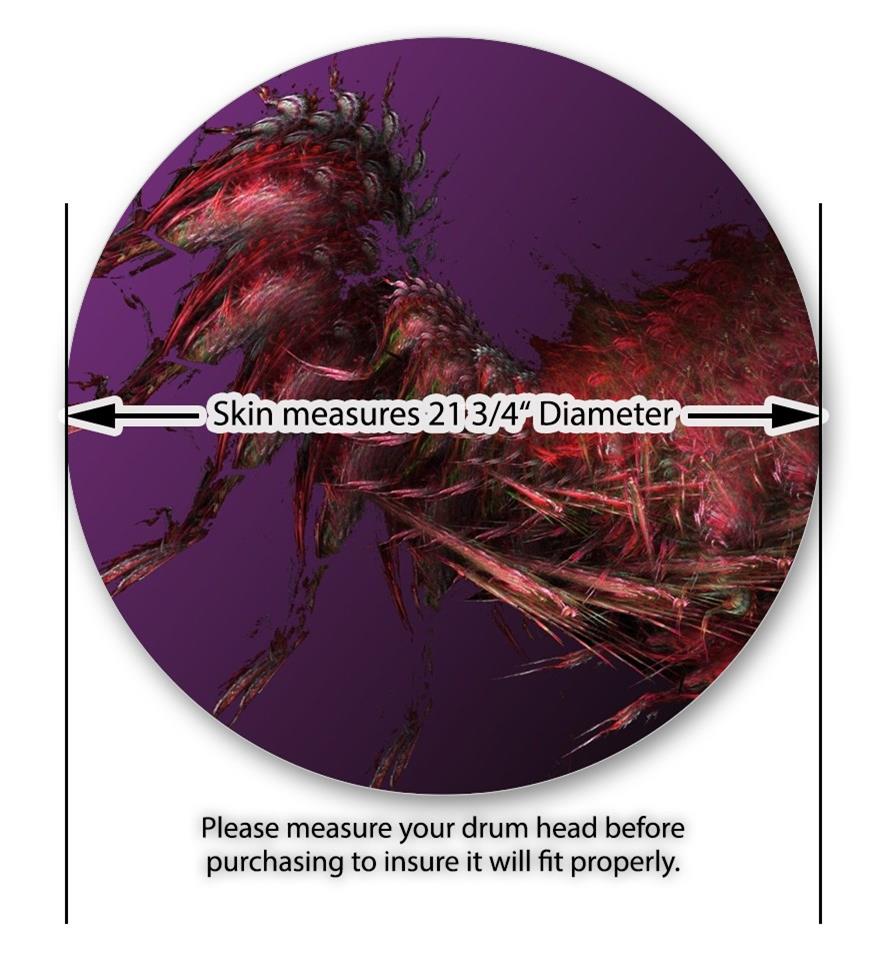 This design also available in other sizes. WraptorSkinz® skin wraps compatible with most kick drum heads. Printed using superb photo quality designs and vibrant colors printed with special fade resistant inks that last even in direct sun for years. WraptorSkinz are a composite three layer commercial grade materials vinyl. The bottom layer is a air release, grey block out removable adhesive that hides existing graphics on the drum head and is easily applied without air bubbles. The middle layer is a flexible vinyl printed with UV protected, fade resistant inks that deliver superb photo quality designs in vibrant colors. Finally, we bond a professional grade laminate over the entire skin adding a glossy protective finish.