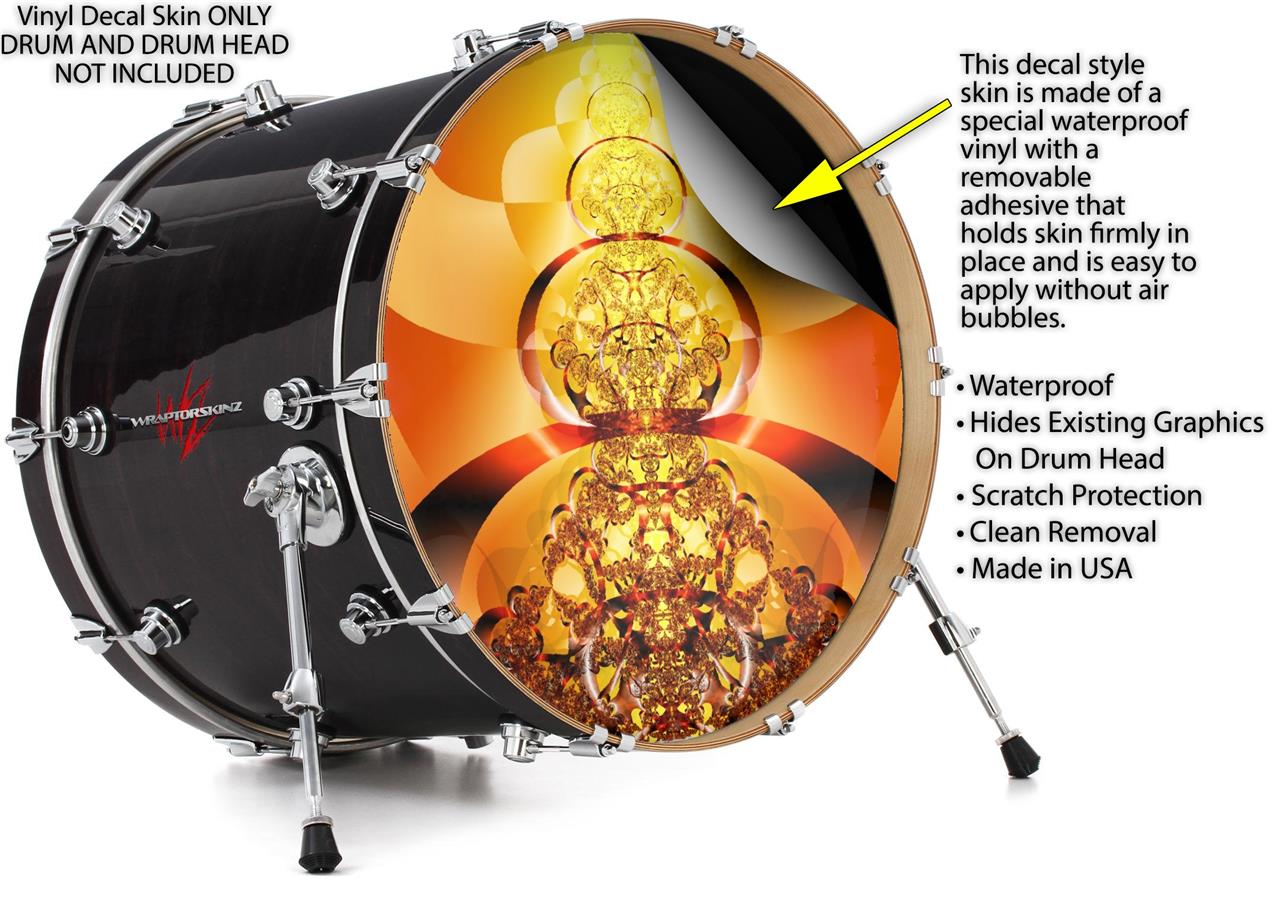 This design also available in other sizes. WraptorSkinz® skin wraps compatible with most kick drum heads. Printed using superb photo quality designs and vibrant colors printed with special fade resistant inks that last even in direct sun for years. WraptorSkinz are a composite three layer commercial grade materials vinyl. The bottom layer is a air release, grey block out removable adhesive that hides existing graphics on the drum head and is easily applied without air bubbles. The middle layer is a flexible vinyl printed with UV protected, fade resistant inks that deliver superb photo quality designs in vibrant colors. Finally, we bond a professional grade laminate over the entire skin adding a glossy protective finish.