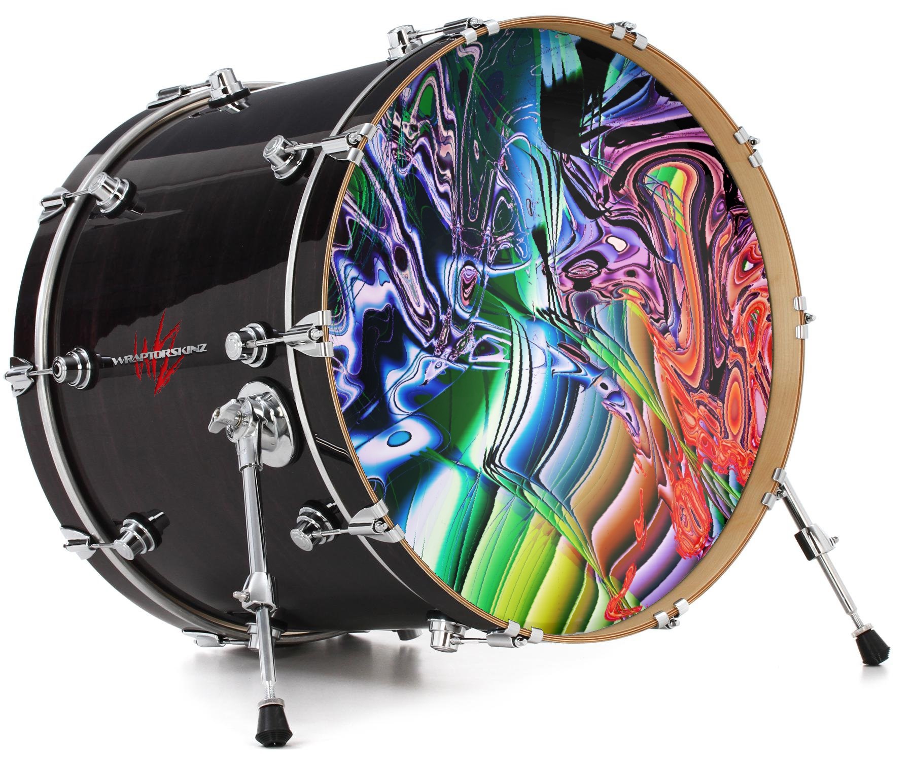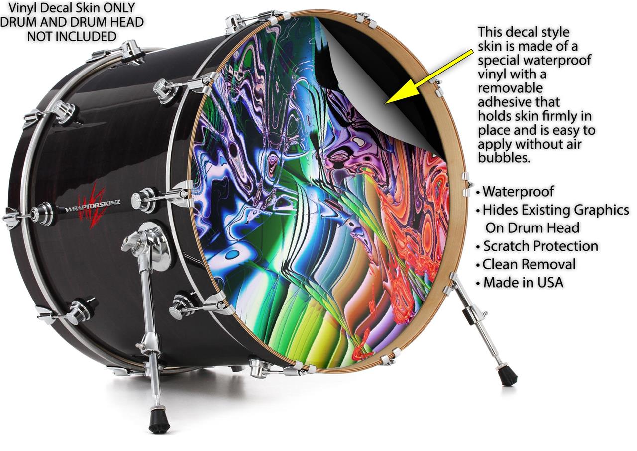 This design also available in other sizes. WraptorSkinz® skin wraps compatible with most kick drum heads. Printed using superb photo quality designs and vibrant colors printed with special fade resistant inks that last even in direct sun for years. WraptorSkinz are a composite three layer commercial grade materials vinyl. The bottom layer is a air release, grey block out removable adhesive that hides existing graphics on the drum head and is easily applied without air bubbles. The middle layer is a flexible vinyl printed with UV protected, fade resistant inks that deliver superb photo quality designs in vibrant colors. Finally, we bond a professional grade laminate over the entire skin adding a glossy protective finish.
