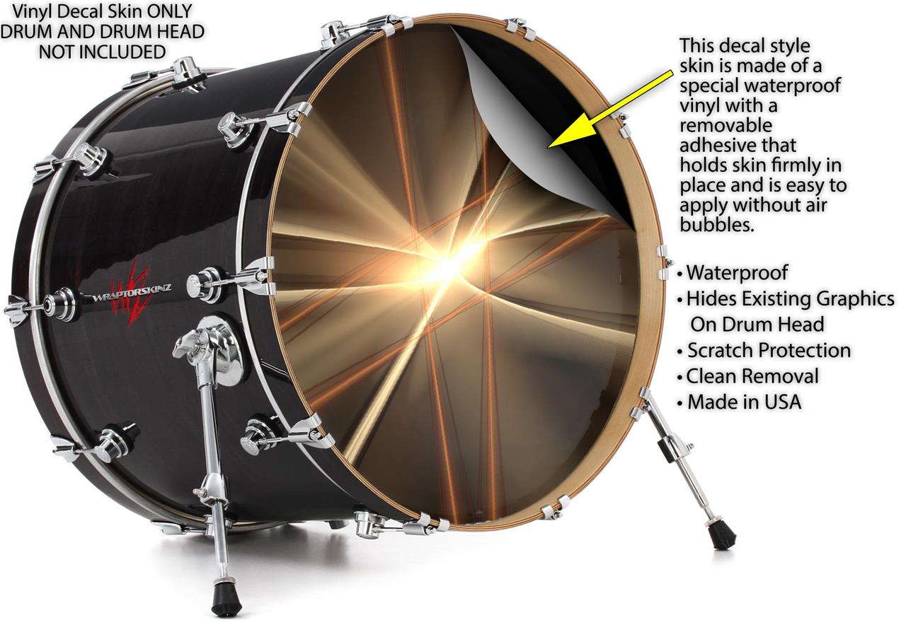 This design also available in other sizes. WraptorSkinz® skin wraps compatible with most kick drum heads. Printed using superb photo quality designs and vibrant colors printed with special fade resistant inks that last even in direct sun for years. WraptorSkinz are a composite three layer commercial grade materials vinyl. The bottom layer is a air release, grey block out removable adhesive that hides existing graphics on the drum head and is easily applied without air bubbles. The middle layer is a flexible vinyl printed with UV protected, fade resistant inks that deliver superb photo quality designs in vibrant colors. Finally, we bond a professional grade laminate over the entire skin adding a glossy protective finish.