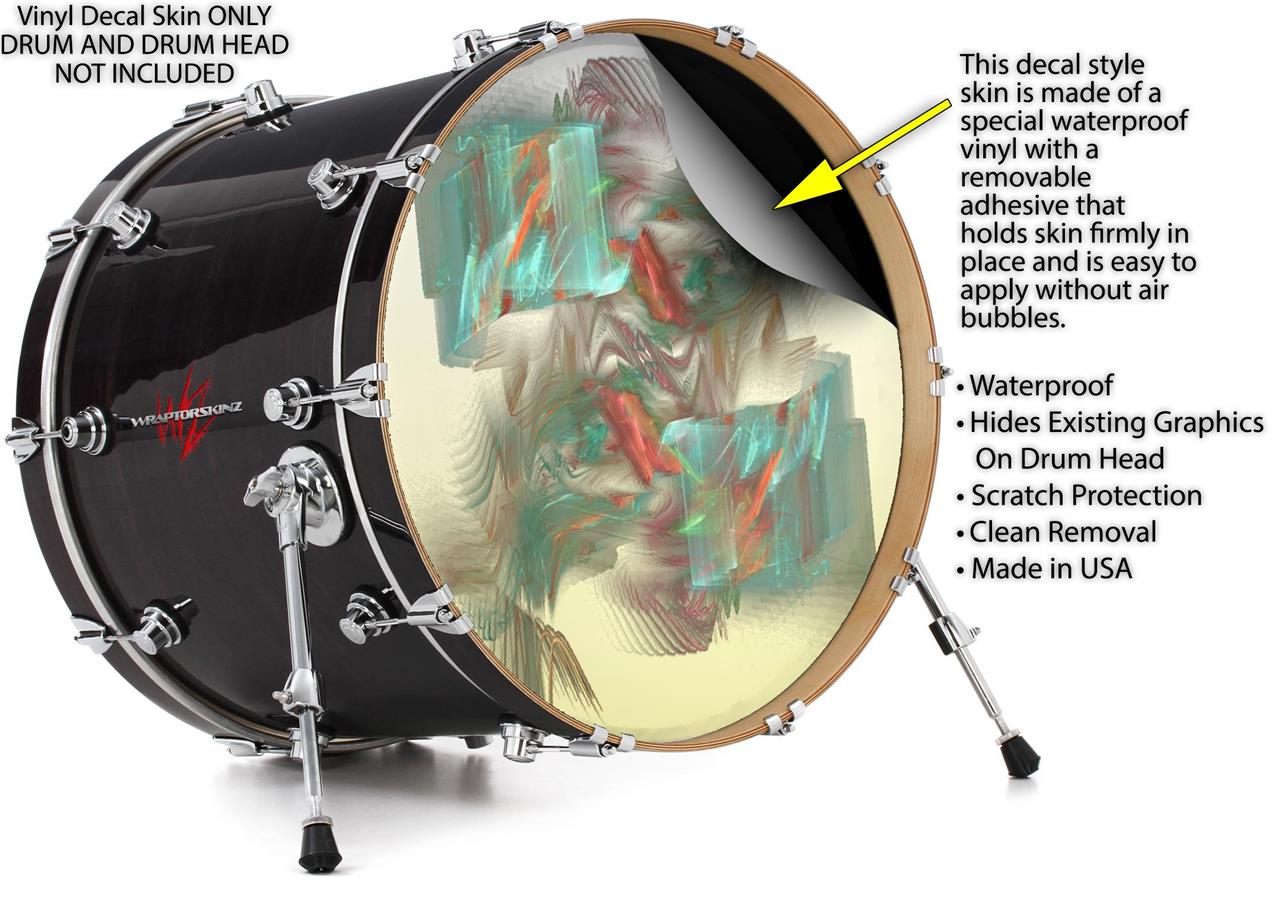 This design also available in other sizes. WraptorSkinz® skin wraps compatible with most kick drum heads. Printed using superb photo quality designs and vibrant colors printed with special fade resistant inks that last even in direct sun for years. WraptorSkinz are a composite three layer commercial grade materials vinyl. The bottom layer is a air release, grey block out removable adhesive that hides existing graphics on the drum head and is easily applied without air bubbles. The middle layer is a flexible vinyl printed with UV protected, fade resistant inks that deliver superb photo quality designs in vibrant colors. Finally, we bond a professional grade laminate over the entire skin adding a glossy protective finish.