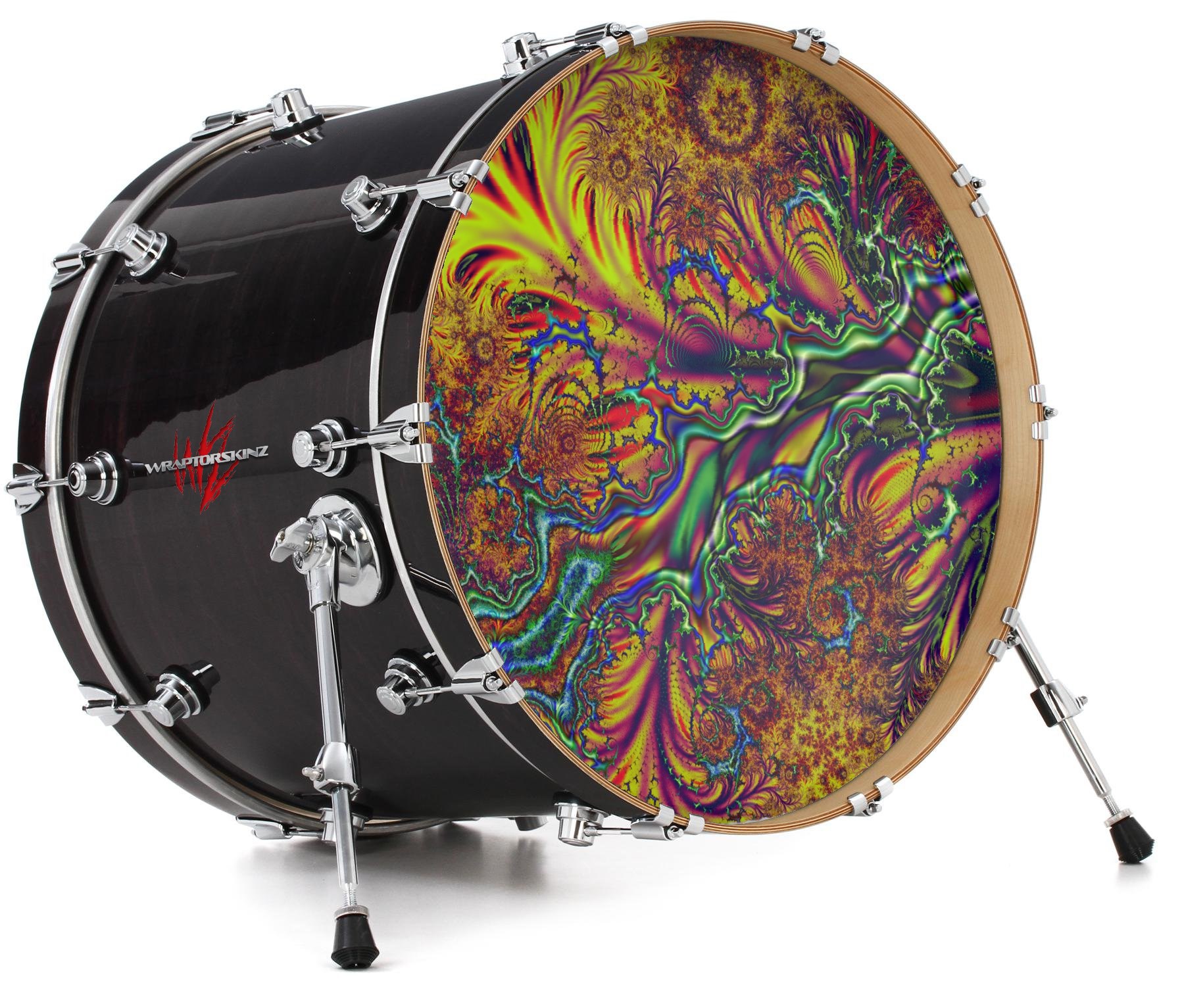 This design also available in other sizes. WraptorSkinz® skin wraps compatible with most kick drum heads. Printed using superb photo quality designs and vibrant colors printed with special fade resistant inks that last even in direct sun for years. WraptorSkinz are a composite three layer commercial grade materials vinyl. The bottom layer is a air release, grey block out removable adhesive that hides existing graphics on the drum head and is easily applied without air bubbles. The middle layer is a flexible vinyl printed with UV protected, fade resistant inks that deliver superb photo quality designs in vibrant colors. Finally, we bond a professional grade laminate over the entire skin adding a glossy protective finish.