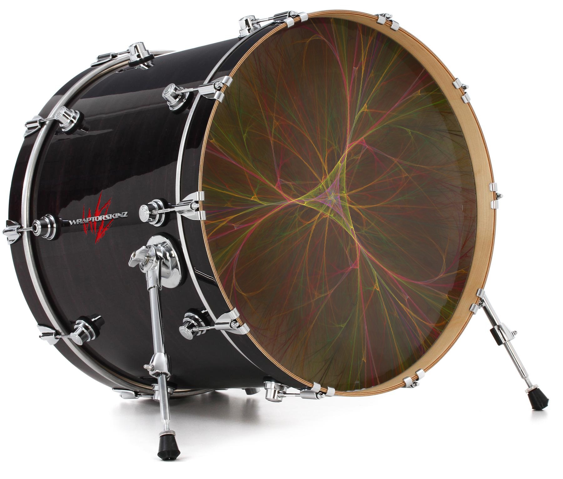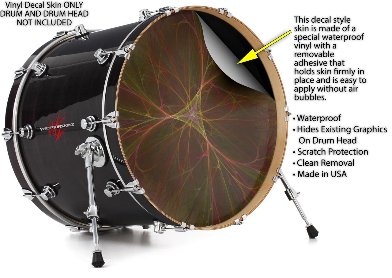 This design also available in other sizes. WraptorSkinz® skin wraps compatible with most kick drum heads. Printed using superb photo quality designs and vibrant colors printed with special fade resistant inks that last even in direct sun for years. WraptorSkinz are a composite three layer commercial grade materials vinyl. The bottom layer is a air release, grey block out removable adhesive that hides existing graphics on the drum head and is easily applied without air bubbles. The middle layer is a flexible vinyl printed with UV protected, fade resistant inks that deliver superb photo quality designs in vibrant colors. Finally, we bond a professional grade laminate over the entire skin adding a glossy protective finish.