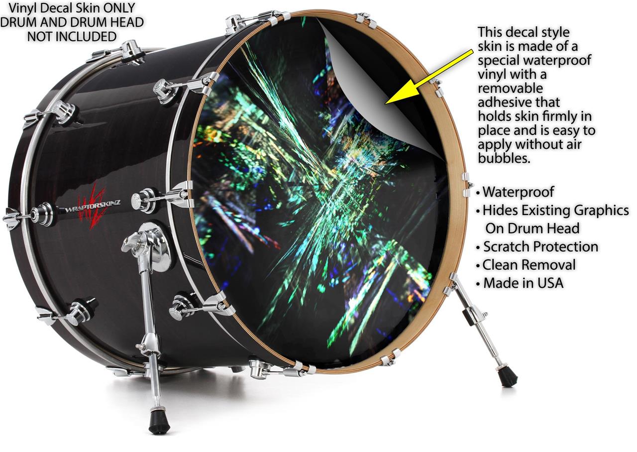 This design also available in other sizes. WraptorSkinz® skin wraps compatible with most kick drum heads. Printed using superb photo quality designs and vibrant colors printed with special fade resistant inks that last even in direct sun for years. WraptorSkinz are a composite three layer commercial grade materials vinyl. The bottom layer is a air release, grey block out removable adhesive that hides existing graphics on the drum head and is easily applied without air bubbles. The middle layer is a flexible vinyl printed with UV protected, fade resistant inks that deliver superb photo quality designs in vibrant colors. Finally, we bond a professional grade laminate over the entire skin adding a glossy protective finish.
