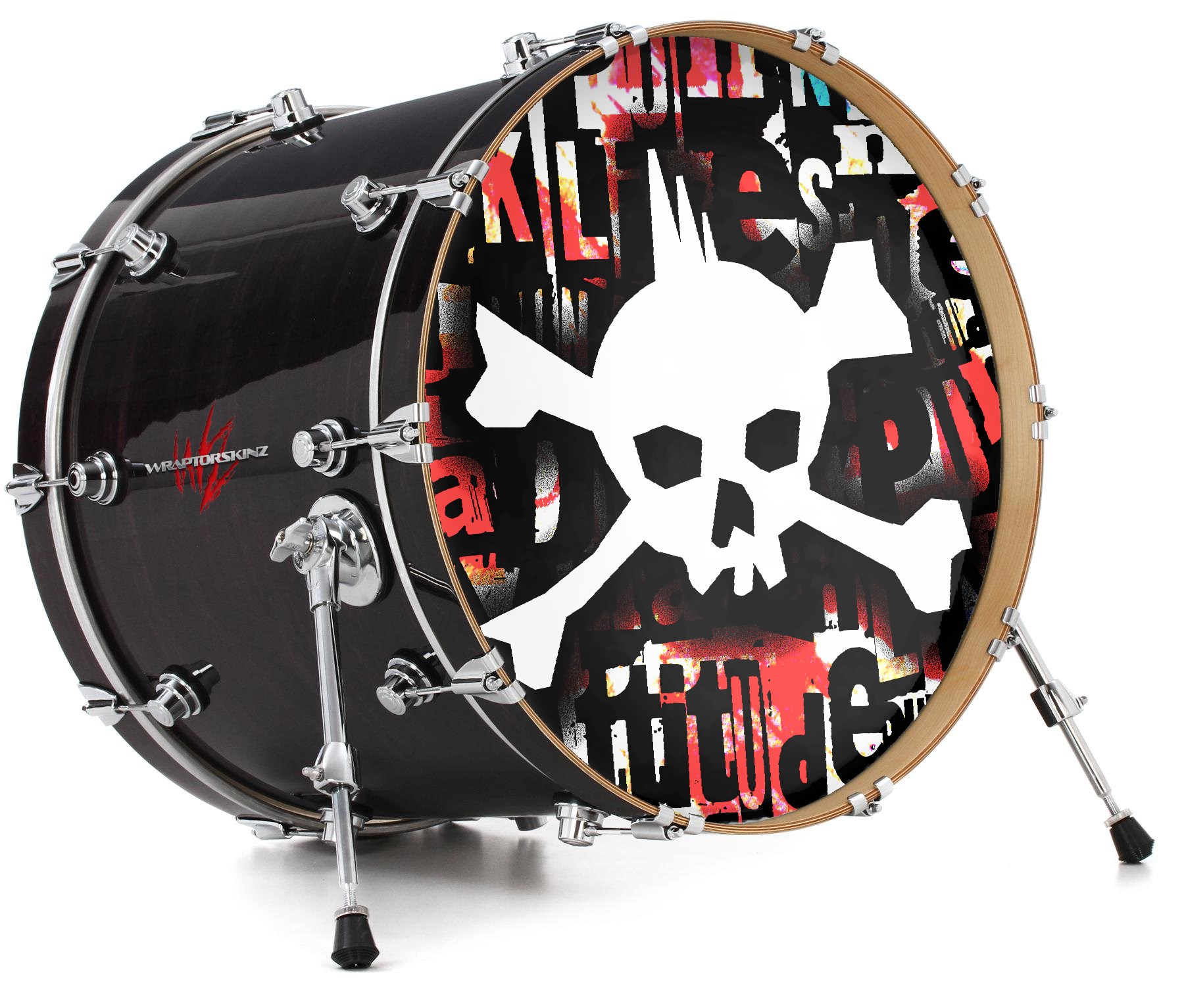 This design also available in other sizes. WraptorSkinz® skin wraps compatible with most kick drum heads. Printed using superb photo quality designs and vibrant colors printed with special fade resistant inks that last even in direct sun for years. WraptorSkinz are a composite three layer commercial grade materials vinyl. The bottom layer is a air release, grey block out removable adhesive that hides existing graphics on the drum head and is easily applied without air bubbles. The middle layer is a flexible vinyl printed with UV protected, fade resistant inks that deliver superb photo quality designs in vibrant colors. Finally, we bond a professional grade laminate over the entire skin adding a glossy protective finish.