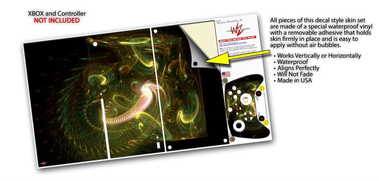 WraptorSkinz® skin wraps for the XBOX Series X gaming console and controller reelase November 2020 are printed using superb photo quality designs and vibrant colors printed with special fade resistant inks that last even in direct sun for years. WraptorSkinz are a composite of two layers of commercial grade materials. The bottom layer is a soft, flexible vinyl with a special removable adhesive that is easily positioned, applied without air bubbles. Next we print the bottom layer with UV protected, fade resistant inks that deliver superb photo quality designs in vibrant colors. Last, we bond a professional grade laminate over the entire skin adding a glossy protective finish. This product is not affiliated with or endorsed by Microsoft or the XBOX brand.