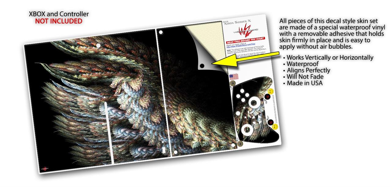 WraptorSkinz® skin wraps for the XBOX Series X gaming console and controller reelase November 2020 are printed using superb photo quality designs and vibrant colors printed with special fade resistant inks that last even in direct sun for years. WraptorSkinz are a composite of two layers of commercial grade materials. The bottom layer is a soft, flexible vinyl with a special removable adhesive that is easily positioned, applied without air bubbles. Next we print the bottom layer with UV protected, fade resistant inks that deliver superb photo quality designs in vibrant colors. Last, we bond a professional grade laminate over the entire skin adding a glossy protective finish. This product is not affiliated with or endorsed by Microsoft or the XBOX brand.