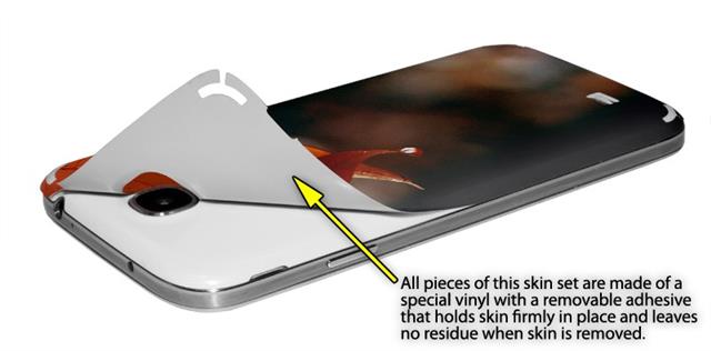 • Decal style vinyl skin covers front and back of Samsung Galaxy S4 phone.