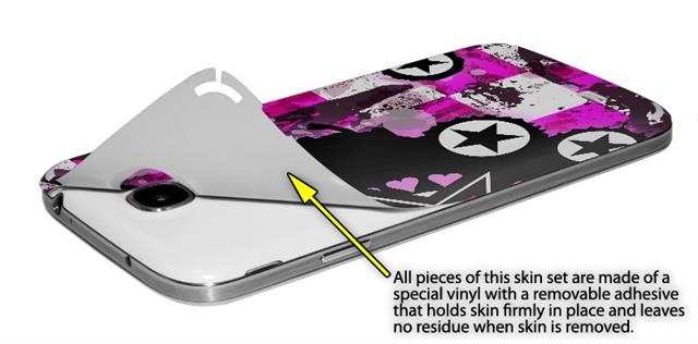 • Decal style vinyl skin covers front and back of Samsung Galaxy S4 phone.