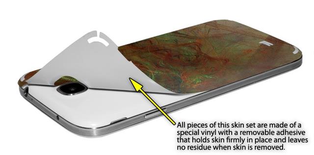 • Decal style vinyl skin covers front and back of Samsung Galaxy S4 phone.