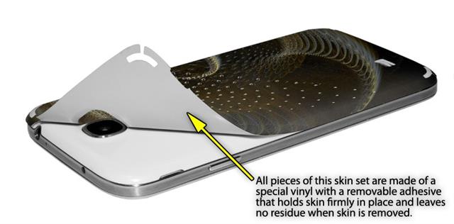 • Decal style vinyl skin covers front and back of Samsung Galaxy S4 phone.