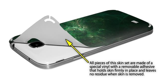 • Decal style vinyl skin covers front and back of Samsung Galaxy S4 phone.