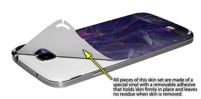 • Decal style vinyl skin covers front and back of Samsung Galaxy S4 phone.