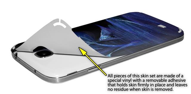 • Decal style vinyl skin covers front and back of Samsung Galaxy S4 phone.