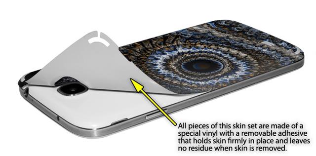 • Decal style vinyl skin covers front and back of Samsung Galaxy S4 phone.