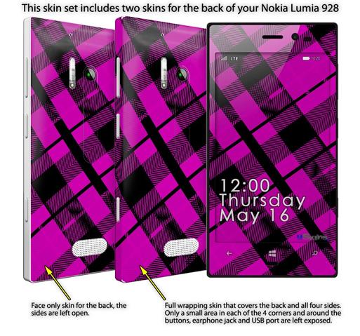 • Decal style vinyl skin covers front, back and side of Nokia Lumia 928 phone.
