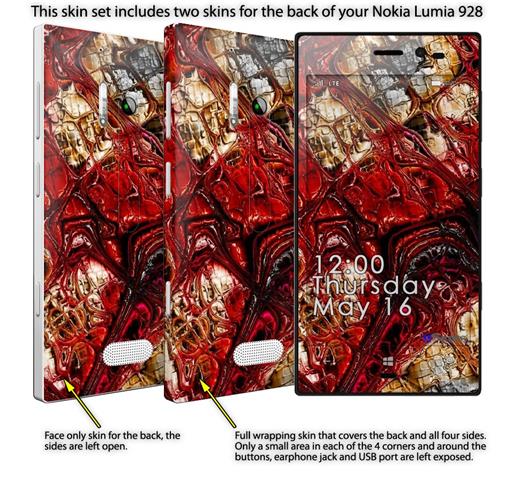 • Decal style vinyl skin covers front, back and side of Nokia Lumia 928 phone.