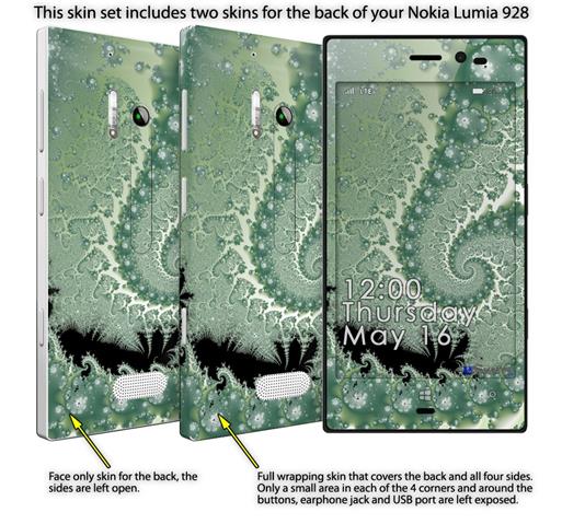 • Decal style vinyl skin covers front, back and side of Nokia Lumia 928 phone.