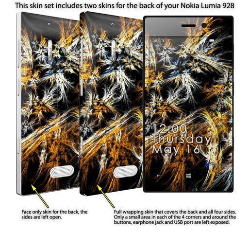 • Decal style vinyl skin covers front, back and side of Nokia Lumia 928 phone.