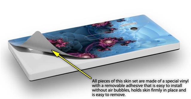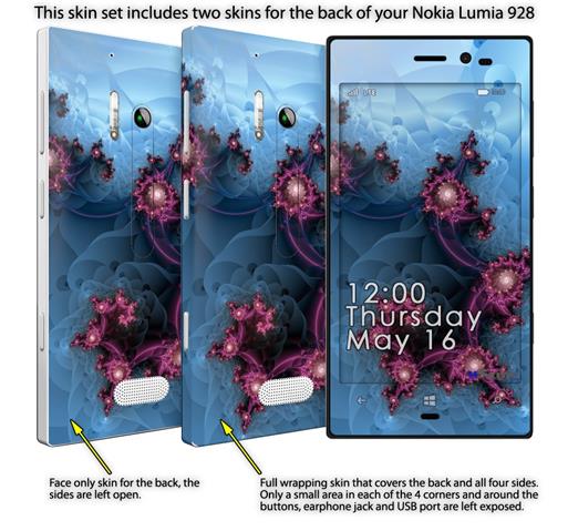 • Decal style vinyl skin covers front, back and side of Nokia Lumia 928 phone.