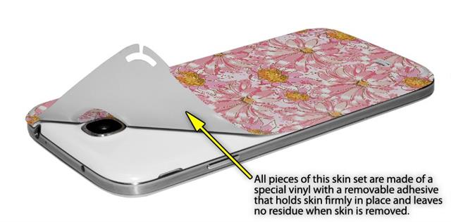 • Decal style vinyl skin covers front and back of Samsung Galaxy S4 phone.