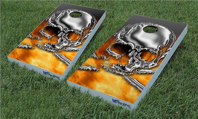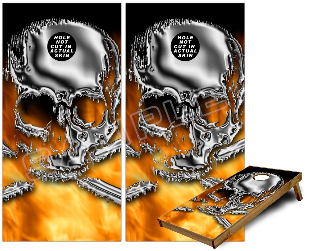 Cornhole Game Board Vinyl Skin Wrap Kit - Chrome Skull on Fire fits 24x48 game boards (GAMEBOARDS NOT INCLUDED)