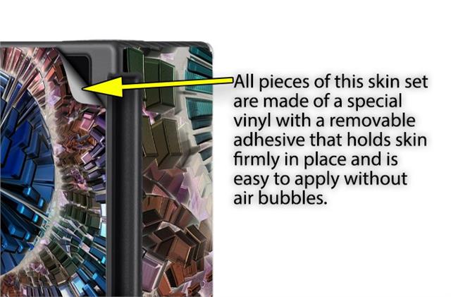WraptoSkinz™ skins are superb photo quality designs and vibrant colors printed with special Eco-Friendly, fade resistant inks. Our skins are self-adhering flexible vinyl skins that helps prevent scratches. Made of composite, multi-layered commercial grade materials. The bottom layer is made with a special removable adhesive that is easily positioned and applied without air bubbles. We print your design on the bottom layer then bond a professional grade laminate over the entire skin adding a glossy protective finish.