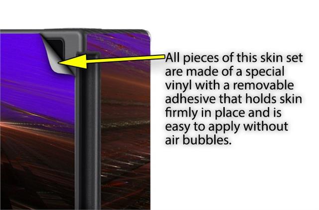 WraptoSkinz™ skins are superb photo quality designs and vibrant colors printed with special Eco-Friendly, fade resistant inks. Our skins are self-adhering flexible vinyl skins that helps prevent scratches. Made of composite, multi-layered commercial grade materials. The bottom layer is made with a special removable adhesive that is easily positioned and applied without air bubbles. We print your design on the bottom layer then bond a professional grade laminate over the entire skin adding a glossy protective finish.