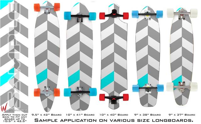 Our longboard skins are made so that one size fits boards up to 10” wide x 42” long. This means after applying the skin it you will trimming to fit you’re the shape of your board with a sharp utility knife.