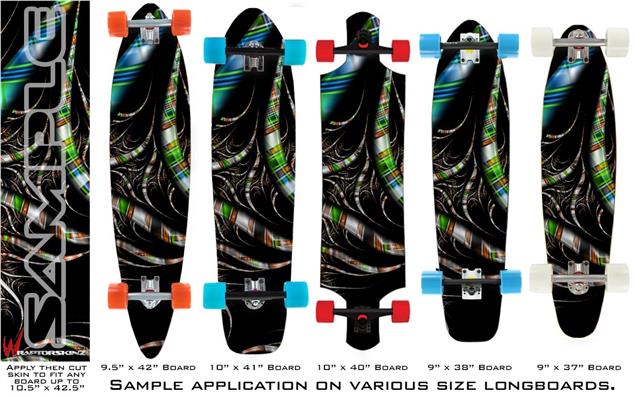 Our longboard skins are made so that one size fits boards up to 10” wide x 42” long. This means after applying the skin it you will trimming to fit you’re the shape of your board with a sharp utility knife.