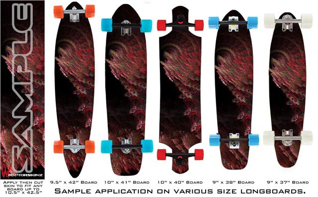 Our longboard skins are made so that one size fits boards up to 10” wide x 42” long. This means after applying the skin it you will trimming to fit you’re the shape of your board with a sharp utility knife.