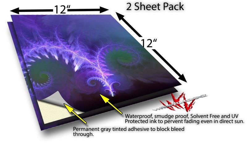 WraptoSkinz™ skin vinyl craft sheets are printed using superb photo quality designs and vibrant colors printed with special UV Protected fade resistant inks that last even in direct sun for years. Unlike other brands our inks are NOT solvent based. WraptorSkinz are a manufactured from professional grade 3mill vinyl. These sheets are waterproof, the designs will not run or smear even if submerged in water.