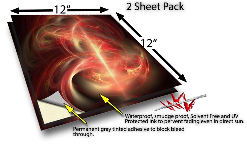 WraptoSkinz™ skin vinyl craft sheets are printed using superb photo quality designs and vibrant colors printed with special UV Protected fade resistant inks that last even in direct sun for years. Unlike other brands our inks are NOT solvent based. WraptorSkinz are a manufactured from professional grade 3mill vinyl. These sheets are waterproof, the designs will not run or smear even if submerged in water.