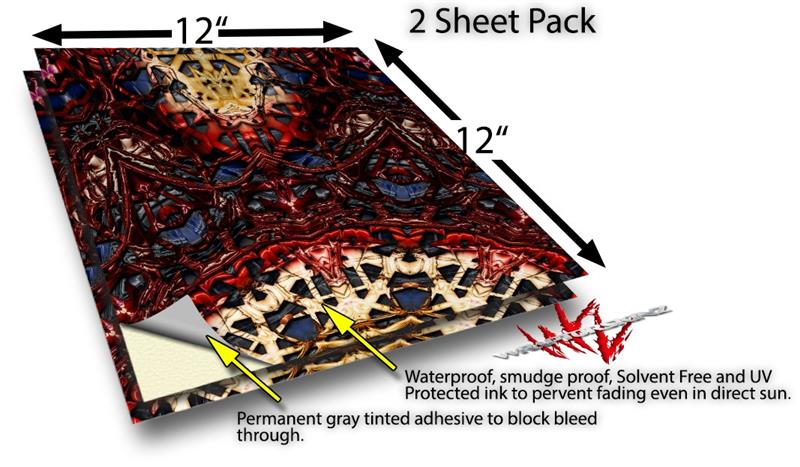 WraptoSkinz™ skin vinyl craft sheets are printed using superb photo quality designs and vibrant colors printed with special UV Protected fade resistant inks that last even in direct sun for years. Unlike other brands our inks are NOT solvent based. WraptorSkinz are a manufactured from professional grade 3mill vinyl. These sheets are waterproof, the designs will not run or smear even if submerged in water.