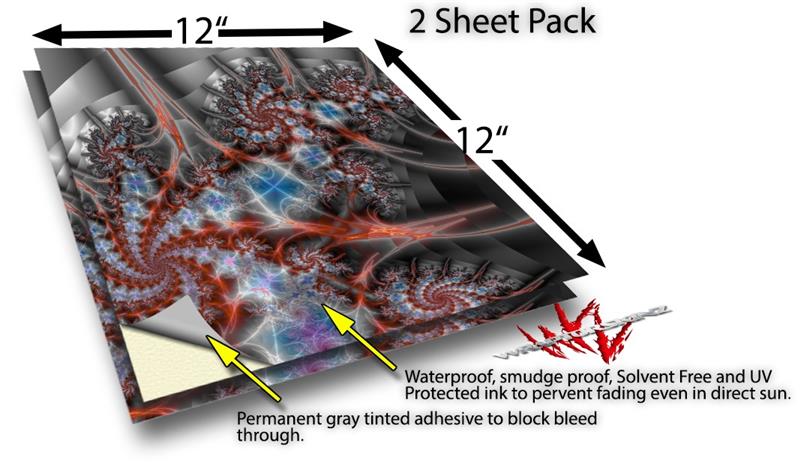 WraptoSkinz™ skin vinyl craft sheets are printed using superb photo quality designs and vibrant colors printed with special UV Protected fade resistant inks that last even in direct sun for years. Unlike other brands our inks are NOT solvent based. WraptorSkinz are a manufactured from professional grade 3mill vinyl. These sheets are waterproof, the designs will not run or smear even if submerged in water.