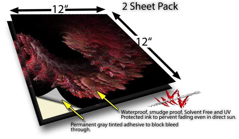 WraptoSkinz™ skin vinyl craft sheets are printed using superb photo quality designs and vibrant colors printed with special UV Protected fade resistant inks that last even in direct sun for years. Unlike other brands our inks are NOT solvent based. WraptorSkinz are a manufactured from professional grade 3mill vinyl. These sheets are waterproof, the designs will not run or smear even if submerged in water.