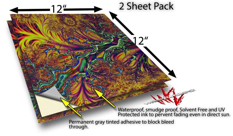 WraptoSkinz™ skin vinyl craft sheets are printed using superb photo quality designs and vibrant colors printed with special UV Protected fade resistant inks that last even in direct sun for years. Unlike other brands our inks are NOT solvent based. WraptorSkinz are a manufactured from professional grade 3mill vinyl. These sheets are waterproof, the designs will not run or smear even if submerged in water.