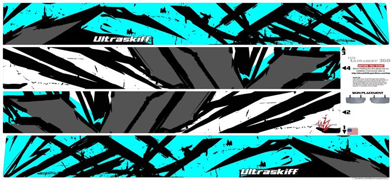 WraptoSkinz™ skin wraps for Ultraskiff 360 are printed using superb photo quality designs and vibrant colors printed with special fade resistant inks that last even in direct sun for years. WraptorSkinz are a composite of two layers of commercial grade materials. The bottom layer is a soft, flexible material with a special ultra-sticky adhesive designed to adhere to plastic body of the Ultraskiff. Next we print the bottom layer with UV protected, fade resistant inks that deliver superb photo quality designs in vibrant colors. Finally we bond a professional grade laminate over the entire skin adding a glossy protective finish.